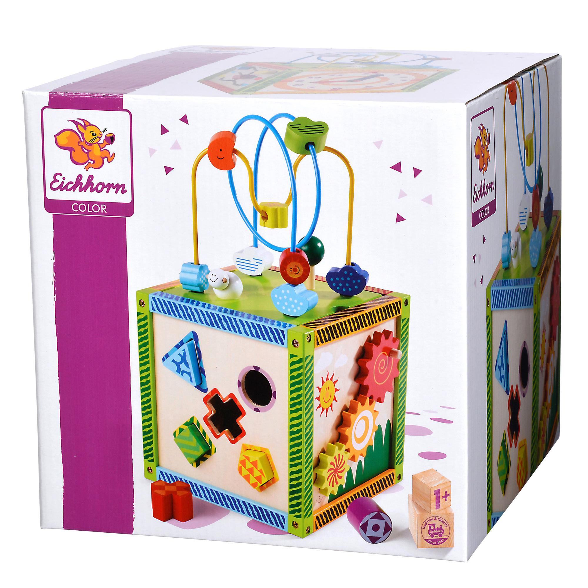 Színes, kocka formájú szórakoztató fejlesztő játék, melynek mindegyik oldala más-más ügyességi feladatot rejt. A tetején golyóvezető található. A játék több területet is fejleszt, felismerhetővé válnak különböző színek, formák, állatok, és számoláshoz golyók. Egy hasznos és jó minőségű játék gyeremekének! A játék 1-3 éves gyerekeknek ajánlott. Anyaga: fa.