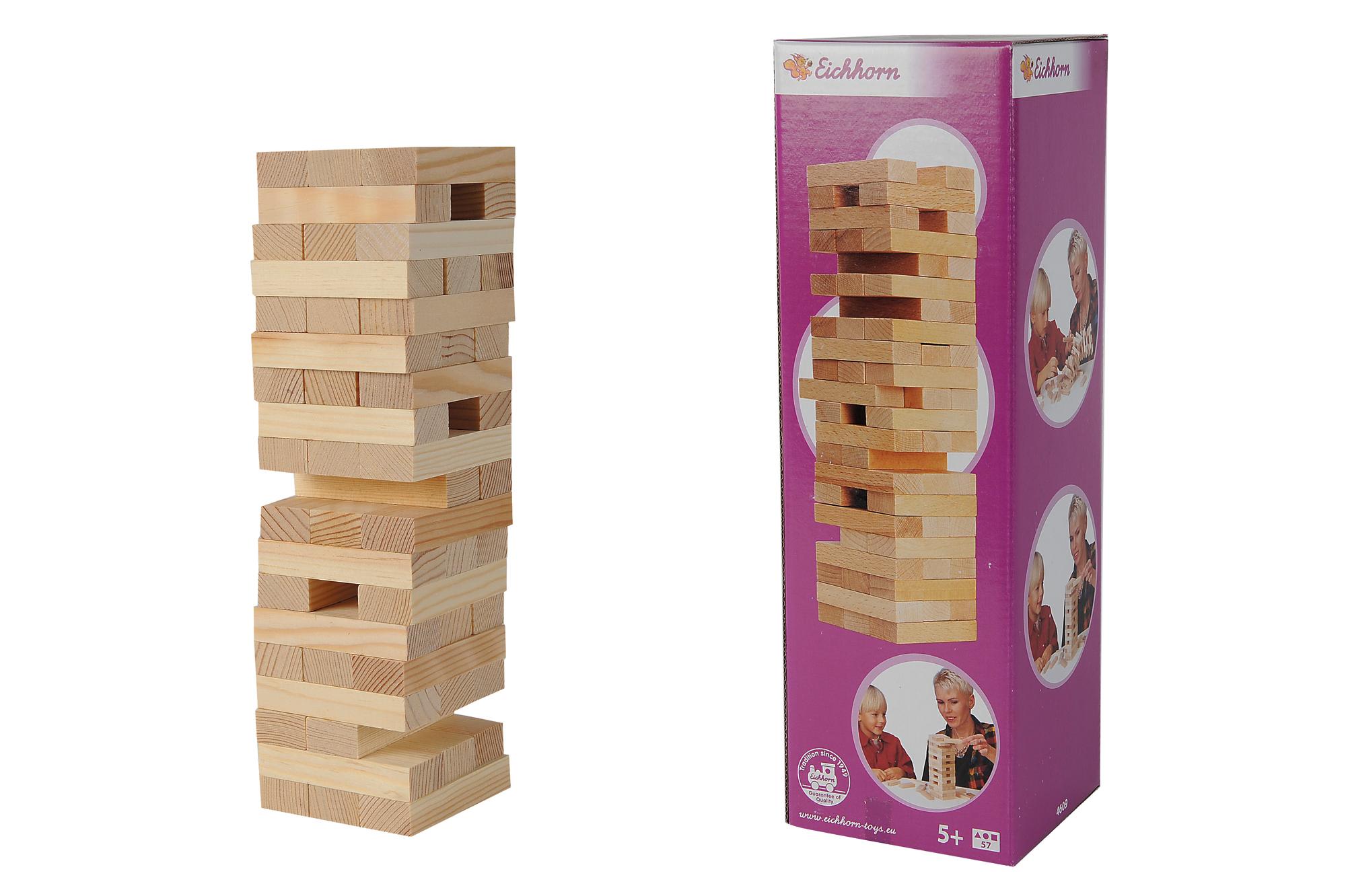 A Simba Balance Tower - fa torony játék egy közkedvelt rakosgatós ügyességi játék kicsiknek és nagyoknak. A játék kezdetén a torony teljesen stabil. Majd minden játékosnak ki kell húzni egy-egy elemet a toronyból és azt az építmény tetejére kell helyezni. A torony billeghet, de nagyon vigyázz, hogy nehogy nálad dőljön össze, mert akkor Te leszel a játék vesztese.Gyors és akciódús ügyességi játék.A doboz 57 db fa építőelemet tartalmaz. 5 éves kortól