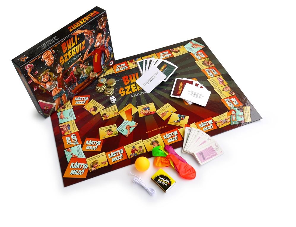 Buliszerviz - a partibeindítóSzervezd te a legjobb bulit, dobd fel a hangulatot, bárhol is üljön össze baráti társaságotok! Dobjatok, lépjetek a söröskupakokkal, húzzatok vicces, vagy akár pikáns kártyákat, és hajtsátok végre a feladatokat, hogy összegyűljön a győzelemhez szükséges 21 Buli Dollár!Akinek sikerült, az lesz az este legnagyobb királya, és mindenkinek egyszerre kell elszavalnia neki a játék győzelmi versét! Nevess a többiekkel a többieken, vagy nevess magadon!Énekelj, mutogass, táncolj, találd ki, párbajozz, vetkőzz, vagyis szórakozz!A játékot 4-8 személy játszhatja.A Buliszerviz egy hangulatfokozó, baráti társaságoknak szóló játék. Haladjatok a mezőkön, húzzatok minél több kártyát, teljesítsétek a feladatokat! A szórakozás és nevetés garantált.A játékdoboz tartalma:1 db játéktábla, 61 db Hangulatkártya, 23 db Bevállalós kártya, 8 db söröskupak, melyek a bábukat helyettesítik, 45 db 1 Buli Dollár, 35 db 2 Buli Dollár, 8 db 5 Buli Dollár, 1 db dobókocka.Kellékek: 6 db lufi, madzag, pingpong labda, gyufásdoboz.A játék célja: Feladatok teljesítésével 21 Buli Dollár megszerzése. Akinek először megvan ez a mennyiség, az a győztes, akinek a többiek térdre ereszkedve elszavalják a Buliszerviz győzelmi versét. Természetesen a játék megkezdése előtt más extra jutalmat is kitalálhattok a győztes számára, csak egymás között kell megegyeznetek.A játék menete:A játékmezők és kártyák alapján Buli Dollárt szerezhettek, és veszíthettek is. A tábla mezőin és a kihúzott játékkártyákon lévő feladatokat kell teljesítenetek, amelyek elvégzése után jár Buli Dollár.Játékkártyák: A játékban 2 féle játékkártya található:HANGULATKÁRTYÁK, melyek könnyen kivitelezhető vicces feladatokat tartalmaznak.BEVÁLLALÓS KÁRTYÁK, melyek már durvább, nem biztos, hogy mindenki számára vállal-ható erotikus, disznó, ciki feladatokat is tartalmaznak. A játék kezdete előtt ti magatok döntsétek el, hogy a bevállalós kártyákkal is játszotok-e! Ha igen, akkor keverjétek a Hangulatkártyák közé a Beváll