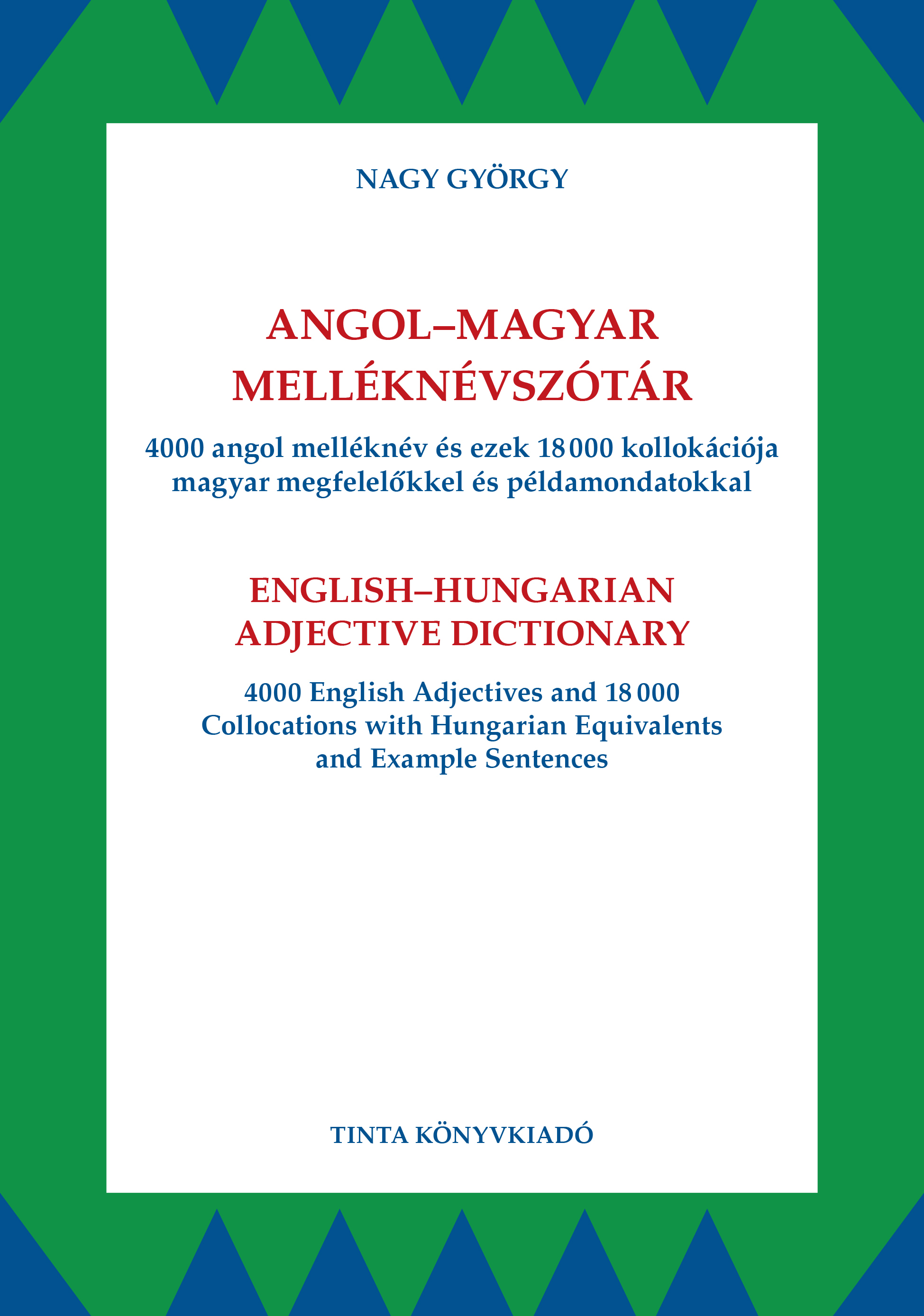 Az Angolmagyar melléknévszótár segítséget nyújt, hogy pontosan és találóan mutassunk be valamit vagy valakit az angol melléknevek helyes használatával.A szótár vázát 4000 angol melléknév alkotja. A szótár melléknevei között vannak a leggyakoribb angol melléknevek, mint például a big nagy; small kicsi; good jó; bad rossz, de megtalálhatók az olyan ritkább és kevésbé ismert angol melléknevek is, mint az enigmatic rejtélyes; leisurely kényelmes; spiteful rosszindulatú; perturbed izgatott; treacherous álnok.A szócikkek élén az angol melléknevek állnak, mellettük azok pontos magyar megfelelőjét találjuk. Ez követik a gyakori melléknév-főnév angol szókapcsolatok. Mind a 18 000 angol szókapcsolat pontos magyar párját is megadja a szótár.Amikor az angol melléknév nem pusztán melléknév-főnév szókapcsolatban áll, hanem az angol nyelvre oly jellemző szószerkezeti egység része az angol melléknév, akkor a szótárhasználók figyelmét erre a ? jel hívja fel. Összesen 1050 ilyen angol szószerkezetet és magyar megfelelőjét közli a szótár.Nagy erénye a szótárnak, hogy a nyelvtanulók érdekeit is kiszolgálva az angol melléknevek pontos használatát 5200 angol és magyar példamondat mutatja be.A szótárban használt több mint 50 szakterületi minősítés (pl. jogtudomány, közgazdaságtan, gasztronómia, csillagászat, matematika) pontosan jelzi a használónak, hogy milyen nyelvi környezetben helyes használni egy-egy minősített melléknévi szókapcsolatot.Az Angolmagyar melléknévszótár a nyelvtanulás minden szintjén hasznos segítség azoknak, akik pontosan és színesen kívánják kifejezni magukat korunk világnyelvén, az angolon.Nagy György az egyesült államokbeli Troy város egyetemének nyugalmazott professzora, számos népszerű és sikeres szótár szerkesztője. A TINTA Könyvkiadónál eddig megjelent munkái többek között az Angolmagyar kifejezések, az Angol közmondások, az Angol elöljárós és határozós igék szótára, az Angolmagyar nagy kollokációszótár, a Magyarangol nagy kollokációszótár, az Angolmagyar nagy szlengszótár és a Thesaurus of English Idioms.