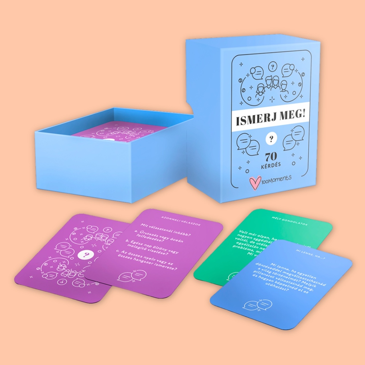 Ismerd meg a barátaidat, családodat és önmagadat úgy, ahogy még soha!Az Ismerj meg! egy különleges kártyajáték, amely segít kiszakadni a hétköznapi felszínes beszélgetésekből, és valódi, tartalmas párbeszédeket indít el. 70 izgalmas kérdés vár rátok, hogy olyan dolgokat tudjatok meg egymásról, amelyek talán még soha nem kerültek szóba. Legyen szó egy családi összejövetelről, baráti estéről vagy csapatépítőről, az Ismerj meg! garantáltan feldobja a hangulatot és mélyebb kapcsolódást teremt a résztvevők között.