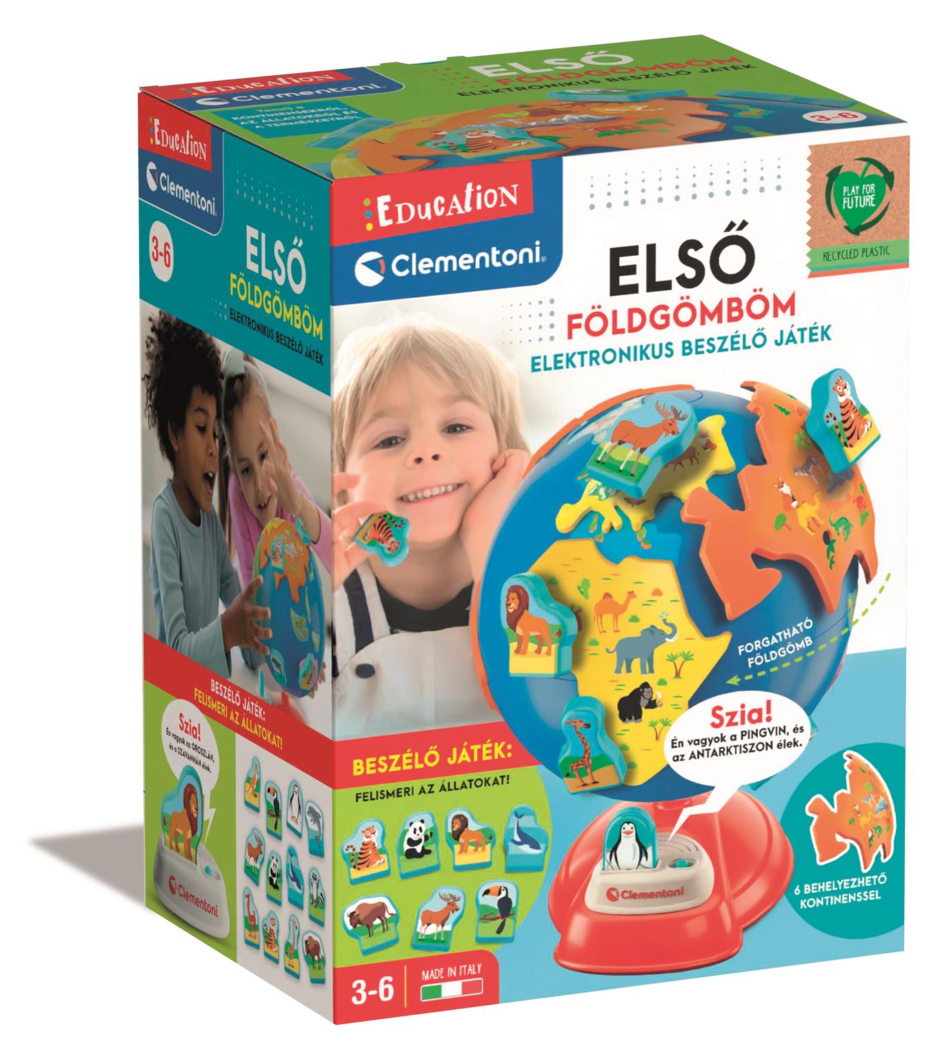 \"Az Első földgömböm egy oktatójáték, amely segít a kisgyermekeknek megismerni bolygónkat a földgömb hagyományos varázsa és az interaktív tanulás ötvözésével. Abeszélő modulnak, valamint az egymáshoz kapcsolódó kontinenseknek és állatoknak köszönhetően a gyermek megtanulhatja az alapvető földrajzi fogalmakat, a kérdéseken keresztül pedig számos állat nevét és egyéb érdekes adatait is megismerheti.\"