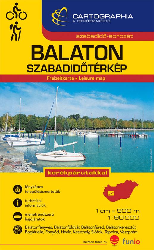 Balaton szabadidőtérkép 1:90 000 méretarányban, kerékpárutak jelölésével, kiegészítő településtérképekkel. A Kis-Balaton és környéke külön térképrészleten szerepel.Részletesebb ábrázolással, külön térképrészleten szerepel:* Káli-medence 1:40 000* Badacsony 1:40 000* Tihanyi-félsziget 1:40 000* Veszprém belváros 1:10 000* Keszthely 1: 15 000* Balatonfenyves centrum 1:18 000* Balatonboglár centrum 1: 18 000* Hévíz centrum 1: 15 000* Siófok centrum 1:22 000* Balatonkeresztúr centrum 1:15 000* Balatonföldvár centrum 1: 20 000* Fonyód centrum 1: 16 000* Tapolca centrum 1: 10 000* Balatonfüred centrum 1:14 000Településismertetők:Veszprém, Keszthely, Balatonfenyves, Balatonboglár, Hévíz, Balatonföldvár, Siófok, Balatonkeresztúr, Fonyód, Balatonfüred, Tapolca