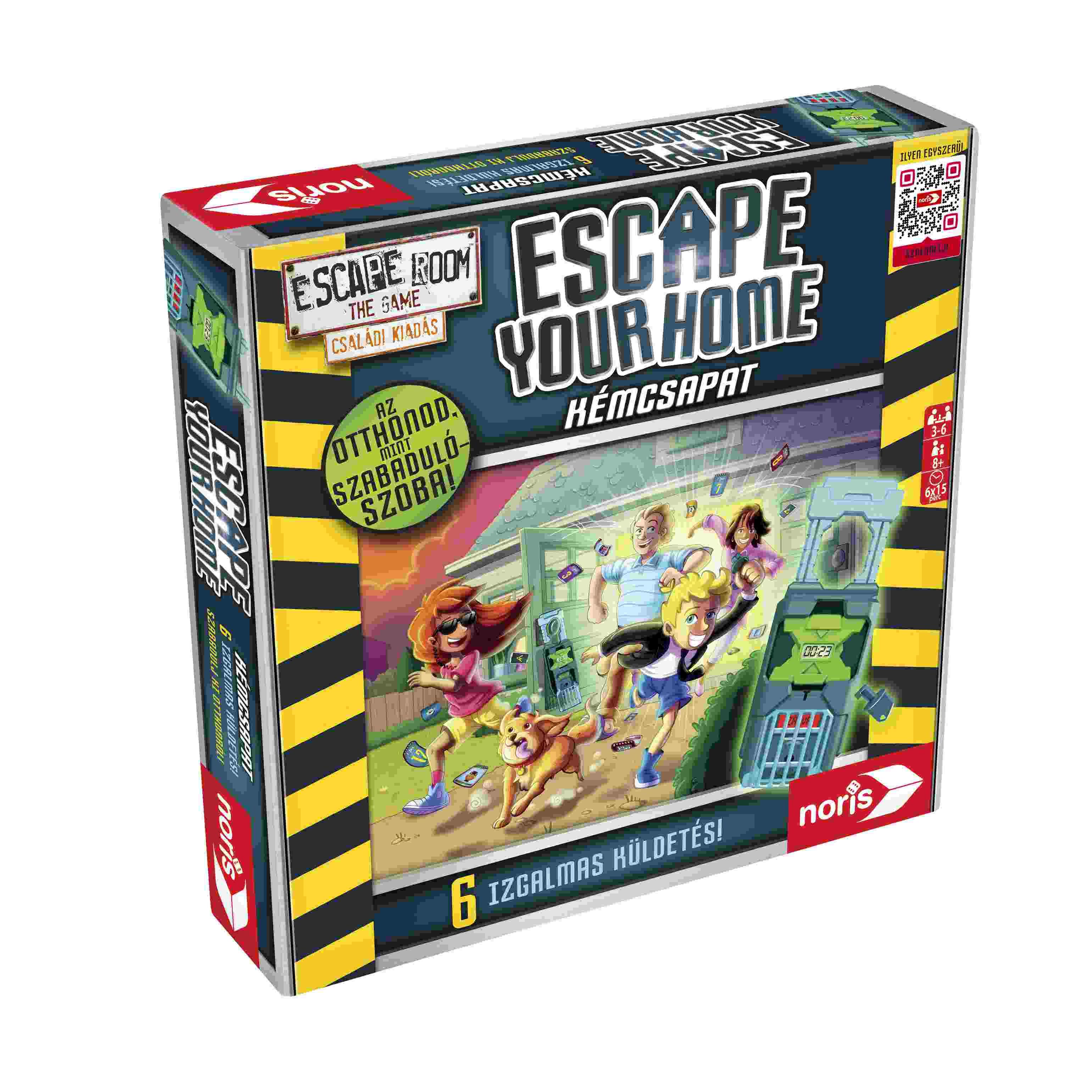 Éljétek át a Escape Room játékcsalád izgalmait a legújabb Escape Your Home társasjátékkal! Dolgozz együtt, oldj meg rejtvényeket, és keress kulcsokat! Változtasd otthonodat menekülőszobává családod vagy barátaid segítségével! Teszteld ne csak az elmédet, hanem a sebességedet is…mert csak korlátozott időd van! Minden küldetésnél pontosan 15 perced van a nyomok megtalálására, a rejtvények megoldására, az ajtózár kulcsának megtalálására és a menekülésre. Játssz az Escape Your Home játékkal otthonod kényelméből! Könnyedén átalakíthatod a házat a küldetés helyszínévé a mellékelt kellékekkel, például az ajtózárral és az időzítővel.A doboz tartalma: 6 küldetés, ajtózár, ajtókulcs, időzítő, 78 rejtvénykártya, 55 válaszkártya, 6 ajtóakasztó, 3 küldetéskártya, területrendezés és pontozókártya és egy játékszabály. Az időzítő 2 db 1,5 V-os LR44 jelű elemmel működik, melyet a csomagolás tartalmaz.Ajánlott korosztály:8 éves kortólJátékosok száma:3-6