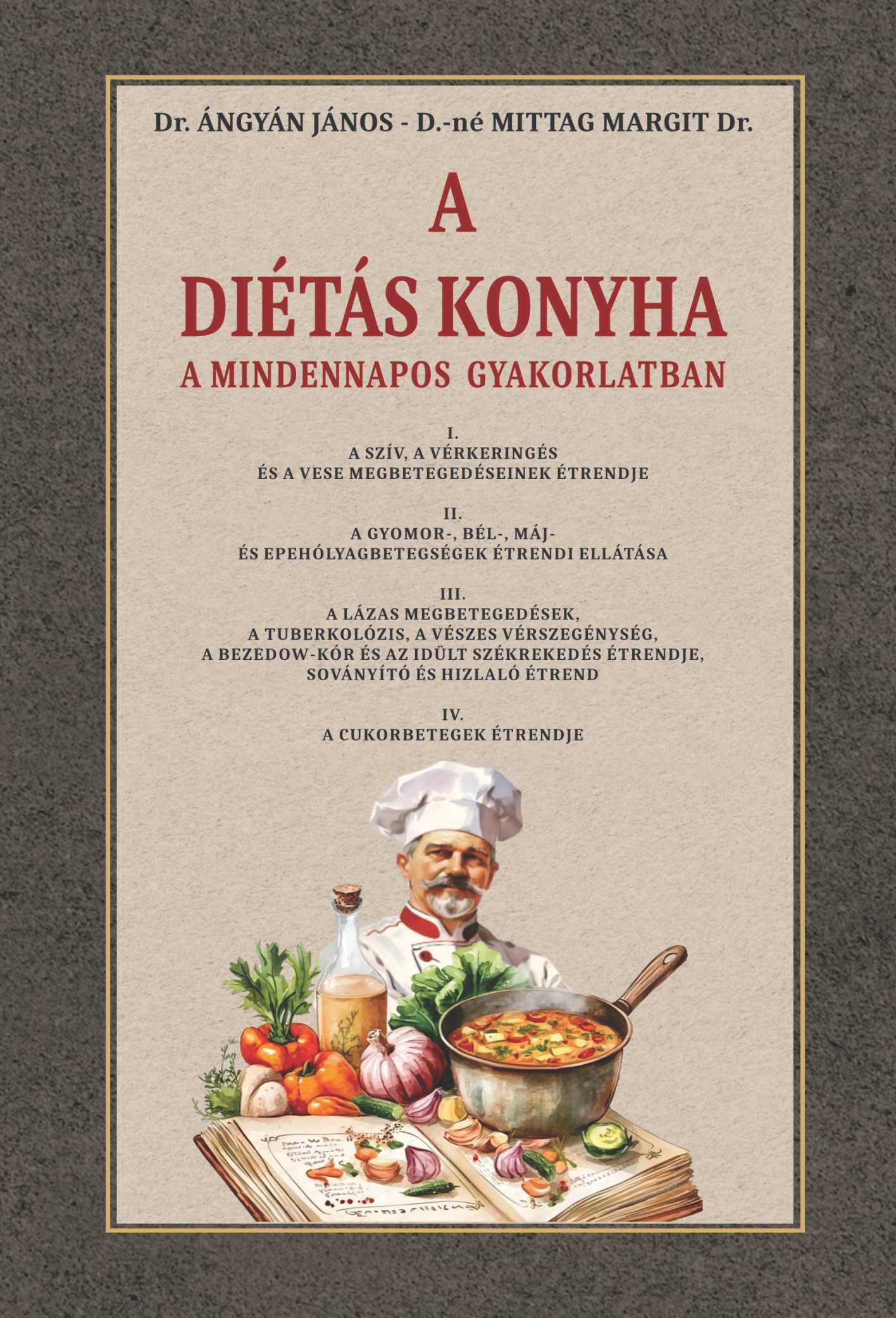 Ahogyan a cím is mutatja – a mindennapos gyakorlatba helyezték a szerzők „receptkönyvüket”. Kötetünk négy különálló gyűjteményt tartalmaz, melyek a különböző betegségek gyógyulásához és a tünetek javításához nyújtanak nagy segítséget. A négy egymástól elkülönülő rész az alábbiakhoz nyújt útmutatást: I.A szív, a vérkeringés és a vese megbetegedéseinek étrendje.II.A gyomor-, bél-, máj- és epehólyagbetegségek étrendi ellátása.III.A lázas megbetegedések, a tuberkulózis, a vészes vérszegénység, a Bazedow-kór és az idült székrekedés étrendje, soványító és hizlaló étrend.IV.A cukorbetegek étrendje.